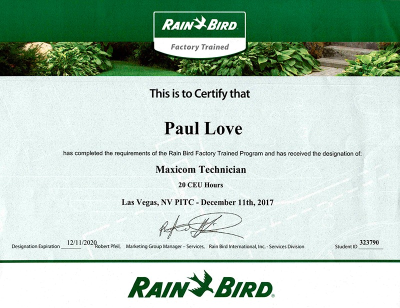 Paul and (son) John Love have attended and received many awards for excellence in the irrigation and lighting profession. They strive to be knowledgeable of all new technology in order to provide the best the market has to offer for their clients. The Love family has expanded their services over the years to now include outdoor lighting, drainage, backflow certification, and automatic mosquito misting systems.